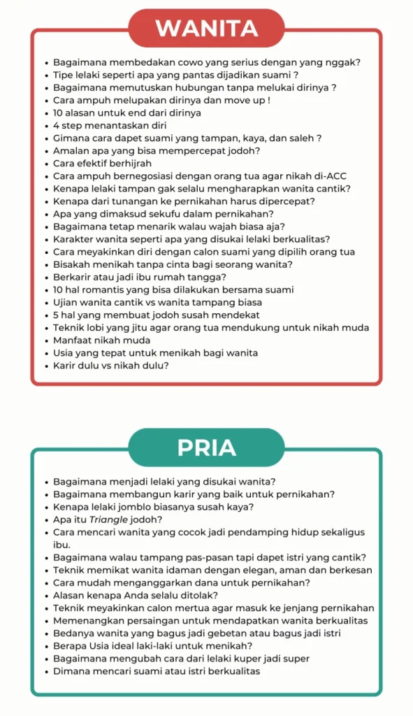 Saya adalah seorang motivator yang dari tahun 2008 fokus untuk mengatasi kegalauan pemuda. Berbagai training, mentoring dan coaching tentang percintaan, jodoh dan pernikahan Islami sudah saya lakukan dari tahun 2010.